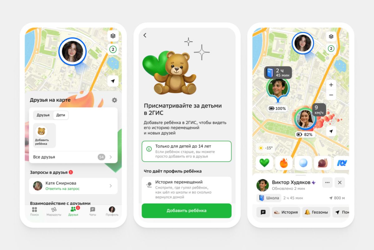 Функция «Друзья на карте» появилась в 2ГИС в 2023 году. Она позволяет делиться своей локацией с близкими, видеть, где кто находится, куда движется, обмениваться эмодзи или общаться в чатах — личных или групповых. Детский профиль стал логичным продолжением — теперь семья может быть на связи, не перебивая день сообщениями «где ты?».