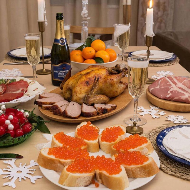 В целом по России: если брать стандартный новогодний набор — салаты, мясо, фрукты, напитки — семья из 4–6 человек часто тратит в районе 7 000–8 000 рублей.