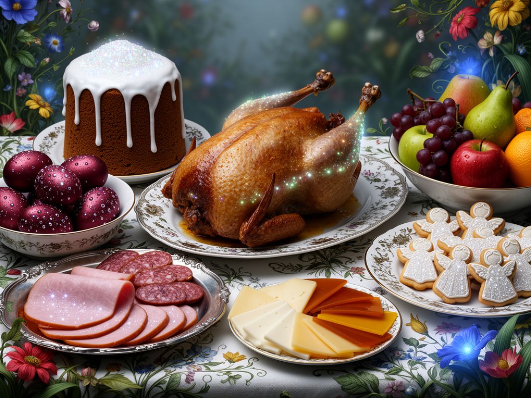 Несколько горячих блюд на столе. Идея праздника подразумевает только одно горячее. В идеале, это должна быть тушка птицы, поросёнка или, например, баранья нога, поданные на стол целиком и символизирующие жертвенного агнца.  Всё остальное — холодные закуски, салаты, выпечка.