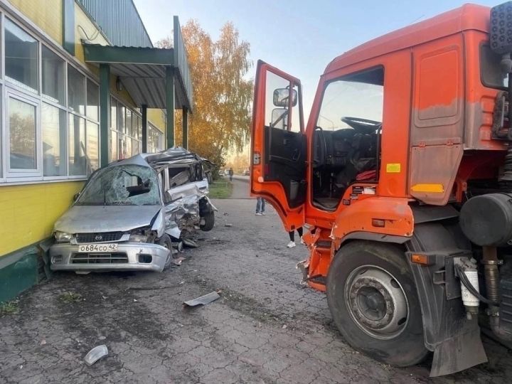КАМАЗ уничтожил легковушку у стены магазина в кузбасском городе