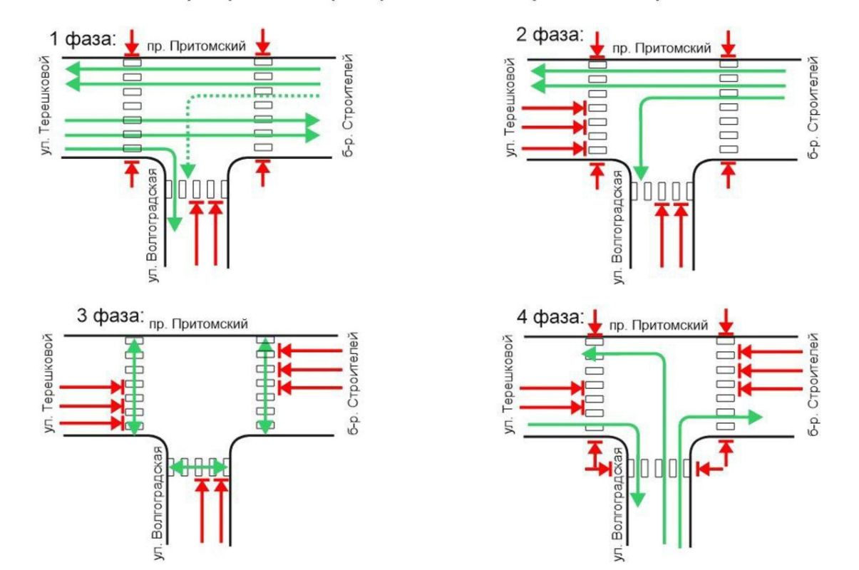 Теперь в первую фазу машинам разрешено ехать по Притомскому проспекту в обоих направлениях, а во вторую фазу движение авто возможно по Притомскому проспекту от бульвара Строителей. В третью фазу пешеходы могут пройти через Притомский проспект и Волгоградскую улицу, в четвертую фазу машины поедут по Волгоградской с дополнительной стрелкой направо с Притомского.