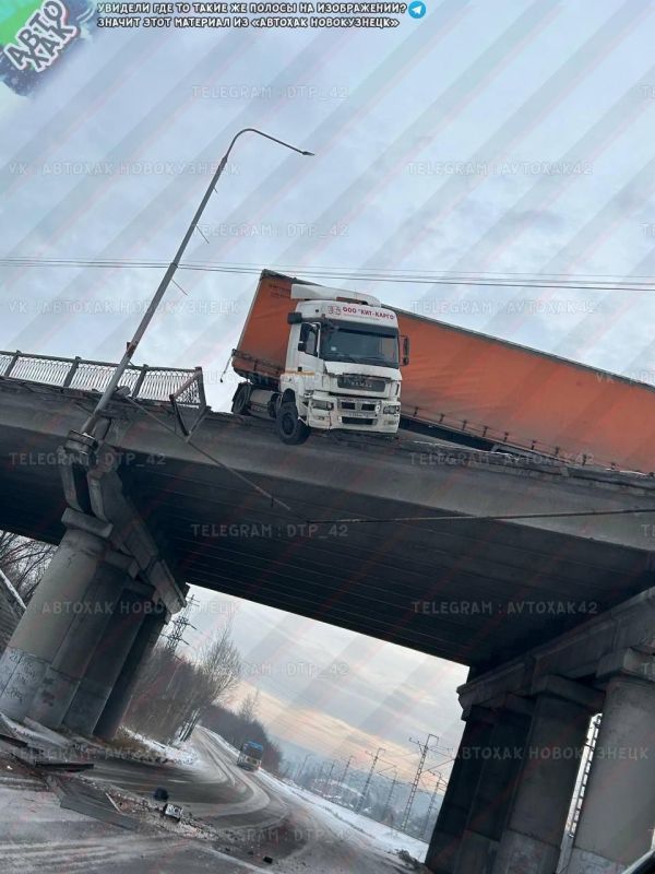 Пост об этом ДТП появился в Сети днем в четверг, 19 декабря. Со слов очевидцев, кабина фуры вместе с водителем свесилась с моста недалеко от поворота в село Бунгур в Новокузнецке. Уточняется, что к месту аварии прибыли стражи закона и спасатели.