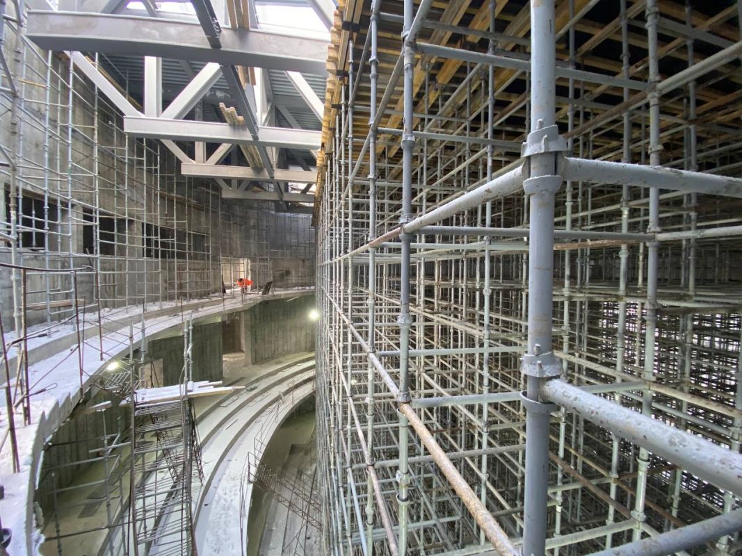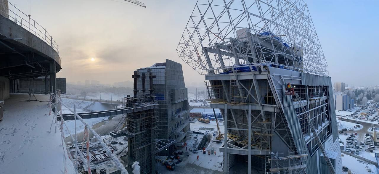 Вместе с тем практически завершена черновая отделка. Теперь специалисты бросили силы на устройство фасадов. На площадку поставлено большое количество инженерного оборудования.