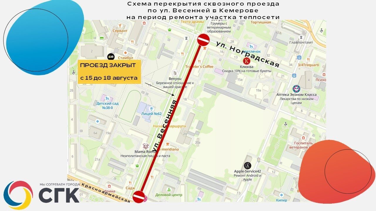 Как сообщили в СГК, для ремонта участка теплотрассы с 7 часов утра 15 августа до 7 часов утра 18 августа будет закрыт сквозной проезд по четной стороне улицы Весенняя, расположенной между улицами Красноармейская и Ноградская.