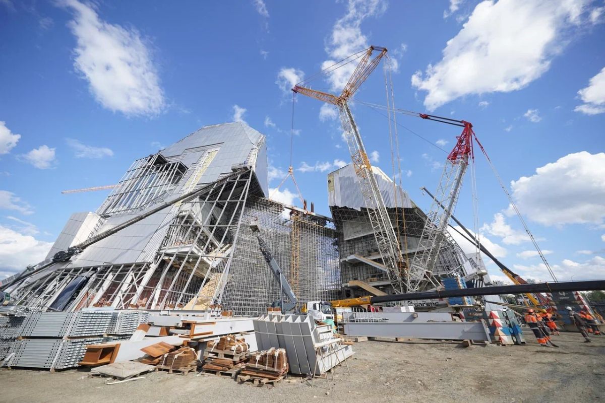 Глава региона отметил, что за июль строители достигли большого прогресса. В настоящее время здесь возводятся фермы, балки, опорные элементы поднимаются на проектную высоту мощными кранами грузоподъемностью 300 и 600 тонн.