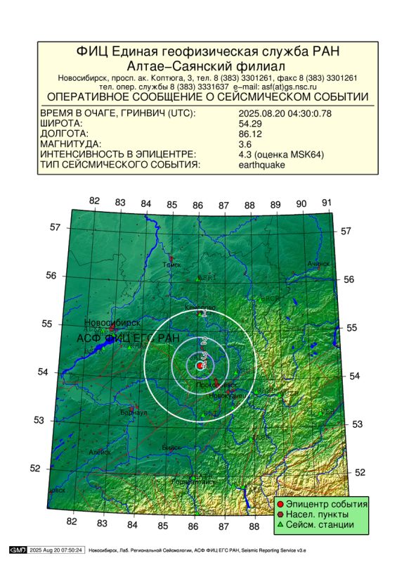 Алтае-Саянский филиал Геофизической службы РАН сообщил, что эпицентр землетрясения, интенсивность которого достигла 4,3 балла, располагался в Беловском округе региона.