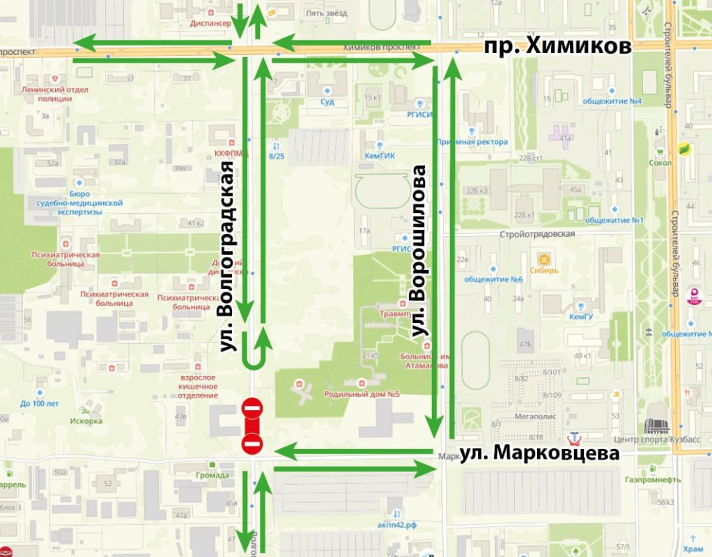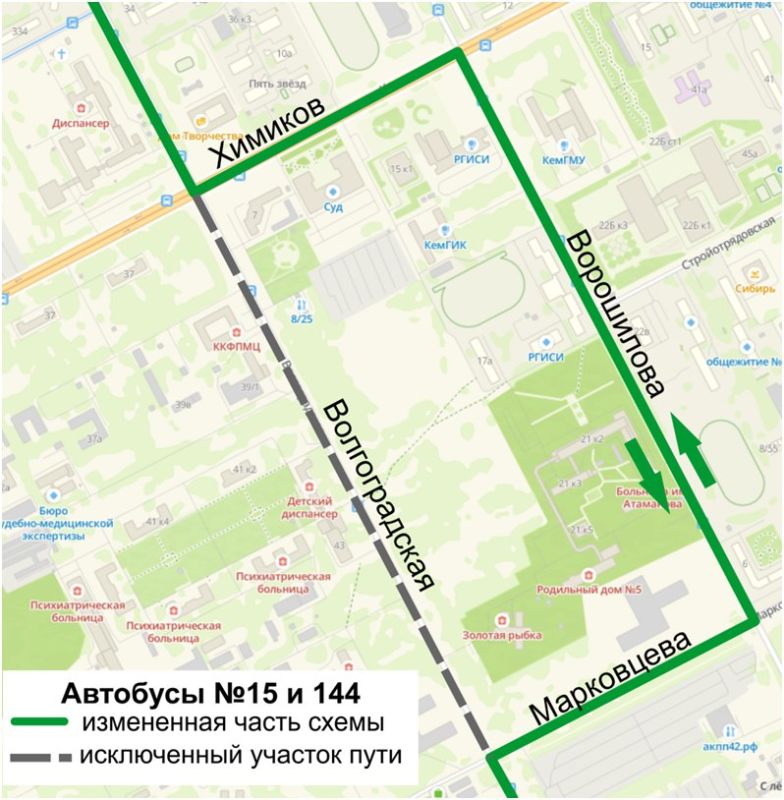 - Автобусы № 15 и № 144 пойдут по объезду: Волгоградская - проспект Химиков - улица Ворошилова - улица Марковцева - снова Волгоградская и дальше своим маршрутом.