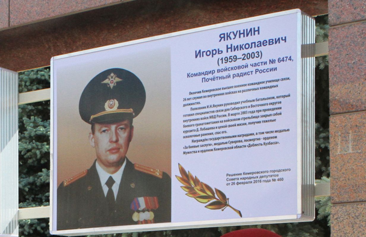 Игорь Николаевич Якунин скончался в 2003 году, защищая жизнь товарища. Во время учебных занятий один из курсантов нечаянно выпустил из рук заряженную боевую гранату. Герой успел вовремя оттолкнуть курсанта и прикрыть взрыв своим телом. За этот подвиг Игорю Якунину было присвоено звание Героя Кузбасса посмертно. Памятник герою установлен на улице Патриотов в городе Кемерово.
