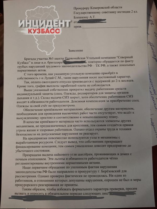 В документе, адресованном прокурору Кемеровской области Александру Блошкину, говорится о систематическом нарушении норм российского законодательства на предприятии.