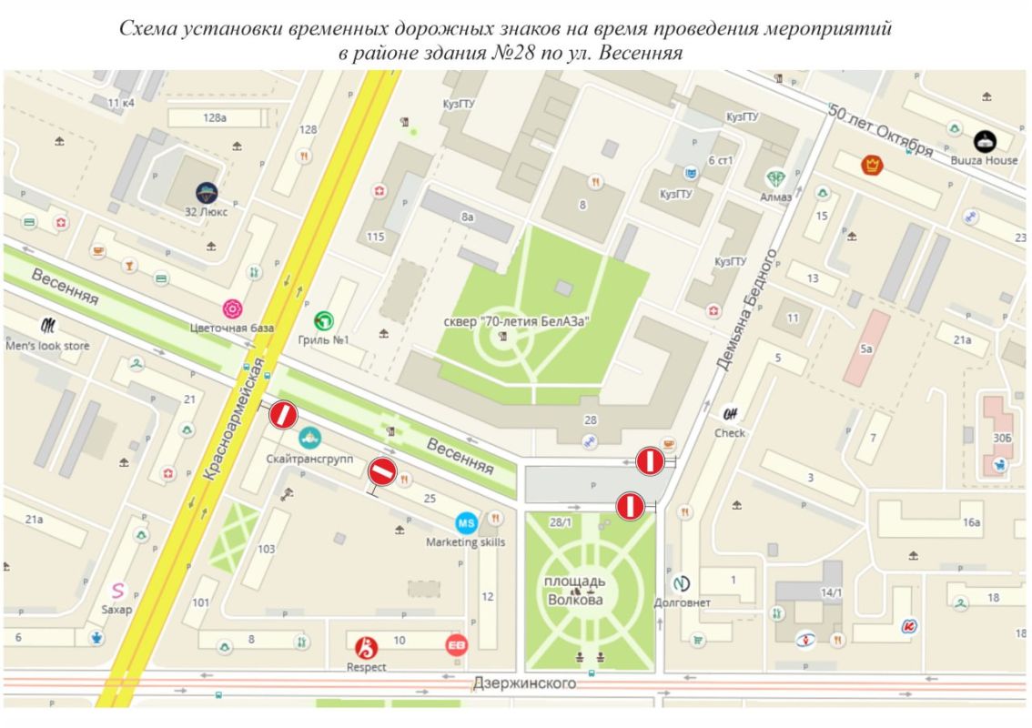 Кроме того, с 7:00 до 14:30 первого сентября проезд по улице Весенней также будет закрыт — начиная от пересечения с улицей Красноармейская и заканчивая улицей Демьяна Бедного. Парковка у указанного дома № 28 на Весенней станет невозможной в этот период.