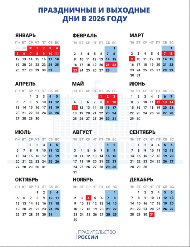 Министерство труда и социальной защиты Российской Федерации опубликовало календарь праздничных и выходных дней на 2026 год.