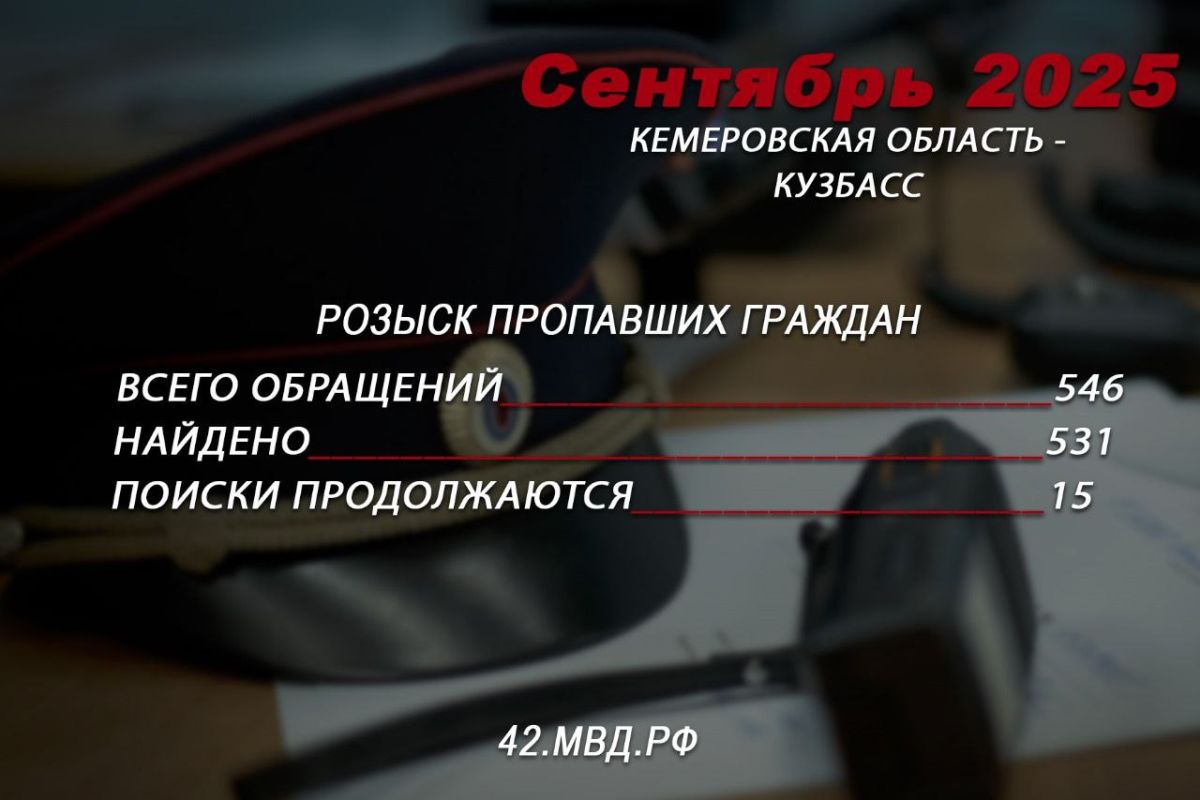Сообщается, что в сентябре 2025 года в розыске находились 546 человек. Из них 531 кузбассовец был найден сотрудниками полиции, в том числе при содействии граждан. Отмечается, что в настоящее время поиски 15 человек продолжаются.