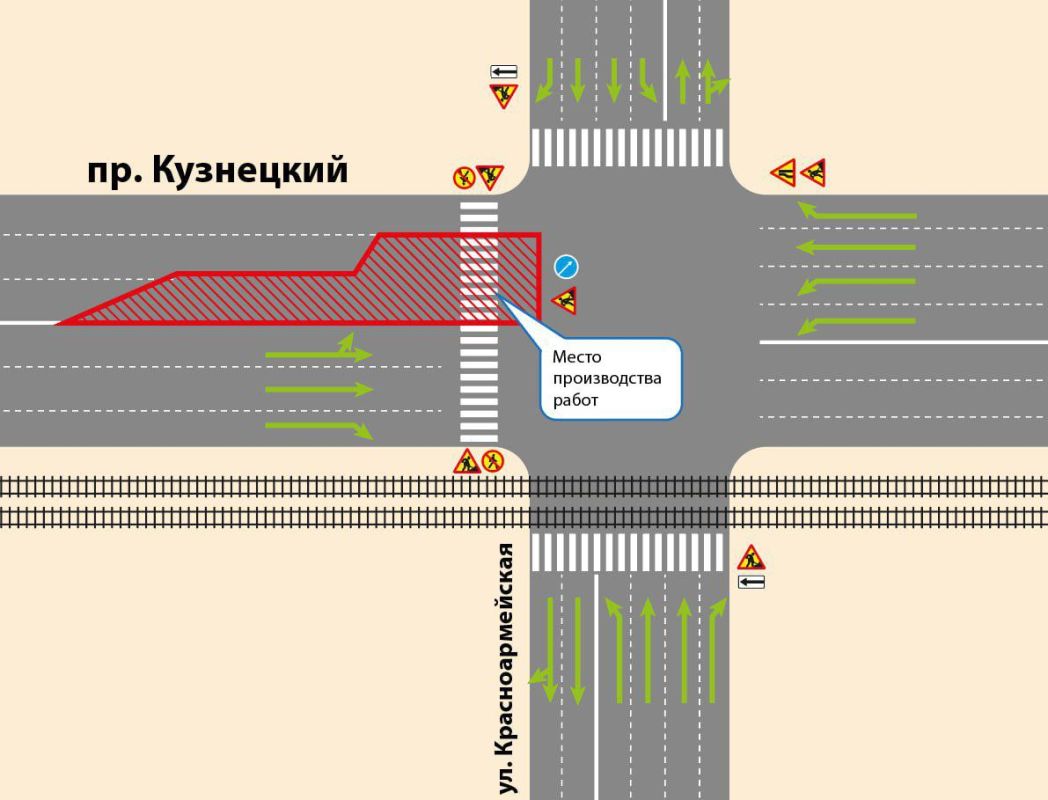Часть полос дороги на проспекте Кузнецком, расположенных перед перекрестком с улицей Красноармейской (по направлению к улице Коммунистической), будет временно закрыта для движения транспорта.