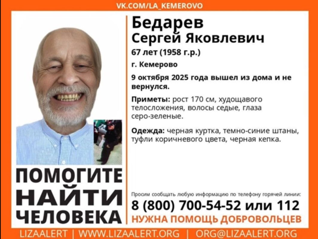 Волонтеры поискового отряда «Лиза-Алерт» сообщили, что в Кемерове пропал мужчина.