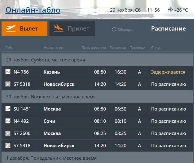 Согласно обновленным данным, рейс авиакомпании «Северный ветер» из Кемерово в Казань отложен на 6,5 часов. Вылет запланирован на 16:30. Ранее полет на самолете Boeing 737 должен был состояться в 08:50 утра, однако из-за позднего прибытия борта из Казани отправление было перенесено.
