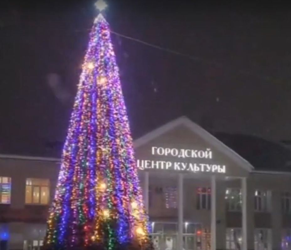 В Мысках на центральной площади установили новогоднюю ель, которая была открыта и украшена накануне.