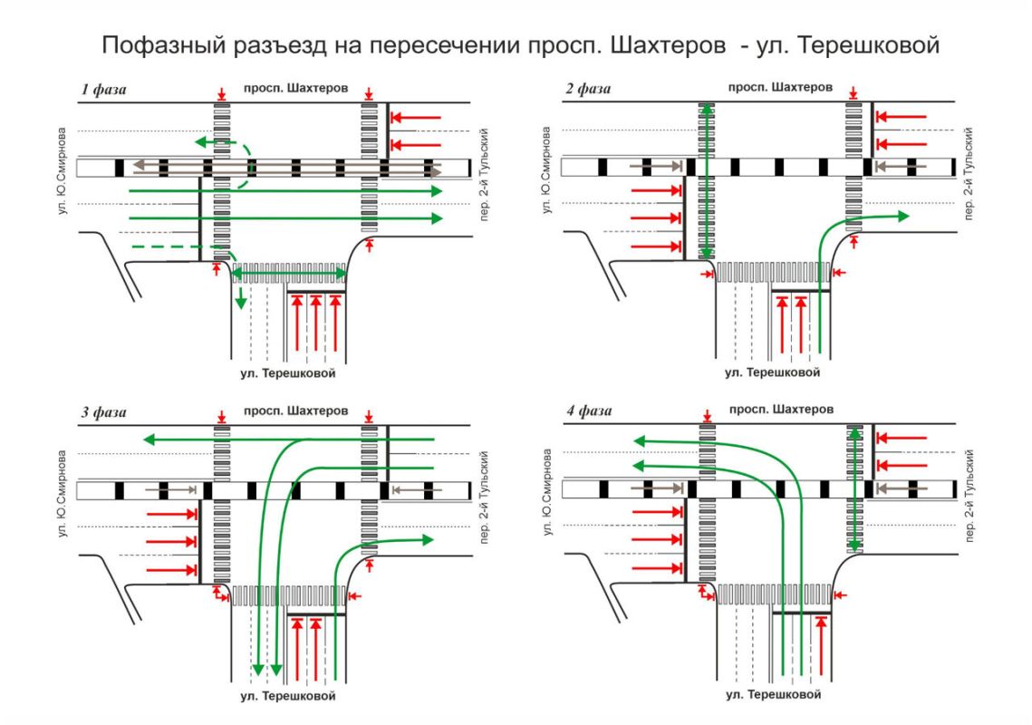 Проезд перекрёстка будет организован по четырём фазам. Схема предусматривает поочерёдное движение транспорта по проспекту Шахтёров и улице Терешковой, отдельные фазы для пешеходов при переходе проезжей части, а также сохранение движения трамваев в обоих направлениях.