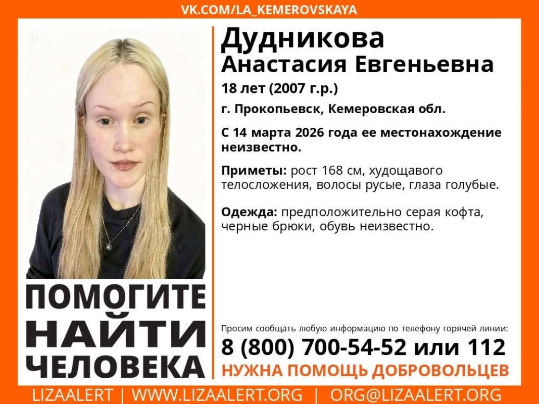 В Прокопьевске ведутся поиски 18-летней девушки. Волонтеры отряда «Лиза Алерат» в Кузбассе сообщили, что 14 марта в Прокопьевске пропала Дудникова Анастасия. Рост девушки 1ещё68 сантиметр, телосложение худощавое, волосы русые, а глаза голубые. Предположительно была одета в серую кофту и черные брюки.