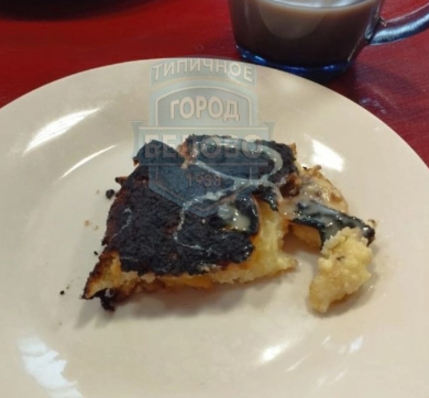 В Сети появилась информация, что в Белове детям на обед подали запеканку, которая была подгоревшей. Об этом можно судить по черной корочке блюда. Причем для сладкого вкуса, вероятно, в попытке скрыть всю горечь испорченной еды, повара добавили сверху каплю сгущенки.