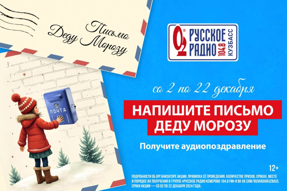 В преддверии праздника «Русское Радио» подарит маленьким кемеровчанам сказку и пришлет каждому участнику акции аудиосообщение от Деда Мороза. Чтобы получить послание от главного волшебника, дети и родители должны написать ему письмо, рассказать о своих желаниях и мечтах, а потом опустить его в почтовые ящики «Русского Радио». Волшебное музыкальное поздравление от Деда Мороза все желающие получат с 23 по 27 декабря.