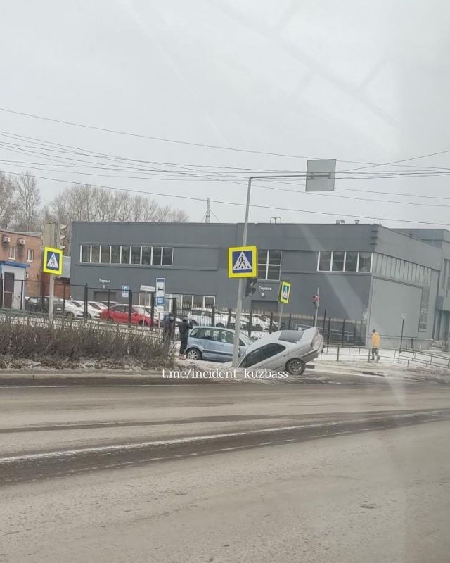 В Новокузнецке в Куйбышевском районе серая легковушка передом съехала с дороги в кювет, в результате чего задние колеса машины оказались в воздухе. Судя по фотографиям, инцидент произошел возле пешеходного перехода.