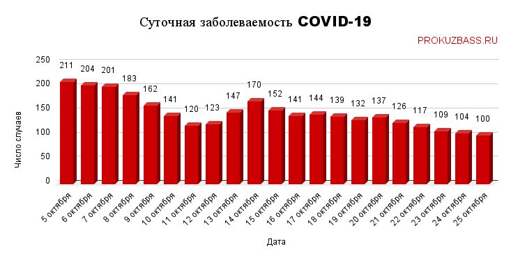 За прошедшие 24 часа 100 кузбассовцев заразились коронавирусной инфекцией, что следует из данных официальной сводки на утро 25 октября. Общее число случаев заражения в регионе достигло 208 321.