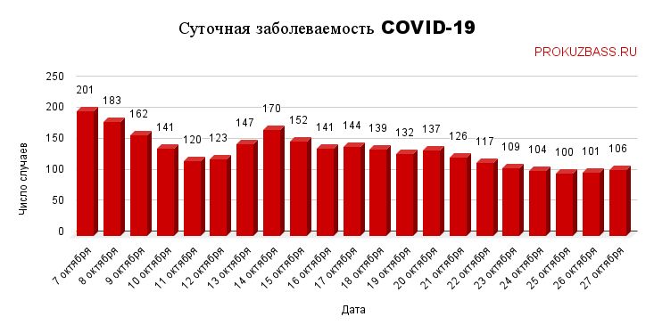 За минувшие сутки 106 кузбассовцев получили положительный результат теста на COVID-19. Отметим, что это первое повышение суточного прироста зараженных за прошедшую неделю. За все время в регионе коронавирус был диагностирован 208 528 раз.