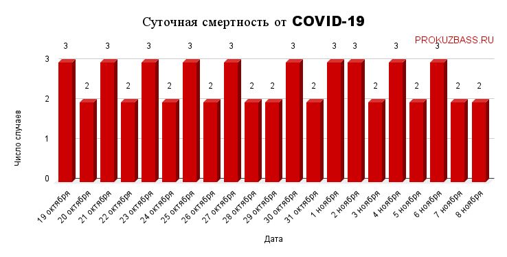 Согласно информации на утро 8 ноября, за минувшие 24 часа двое кузбассовцев скончались после того, как заболели коронавирусной инфекцией. Всего коронавирус унес жизни 2 750 человек в регионе.